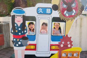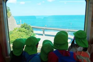 久慈駅では出発前から噴水や恐竜のパネルに興味津々の子どもたち。三鉄の車内では、窓の外に広がる景色に「おばあちゃんち見えるかな?」「海が見えたあ!」と声を弾ませながら、三鉄体験を楽しんでいました。安家川橋梁で列車が停車すると、感激した様子でマリンブルーの海を眺めていました。