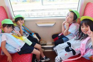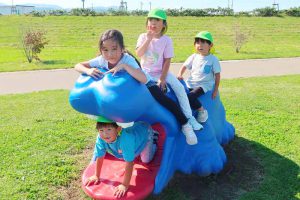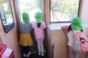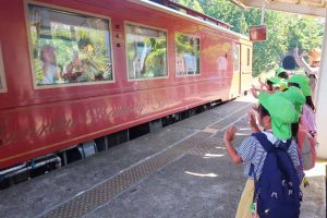 お弁当の時間には、お友だちとお弁当を見せ合いながらうれしそうにモリモリと食べて、びっくりするほどの食欲に手作りお弁当の力を改めて感じました。食後にのんちゃんパークの遊具で遊んでいると、「あっ!三鉄だ!」と線路を走る列車を見つけ、元気いっぱいに手を振って見送りました。何度も「また来たいね!」と笑顔で話すたんぽぽさんたちでした。