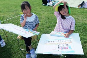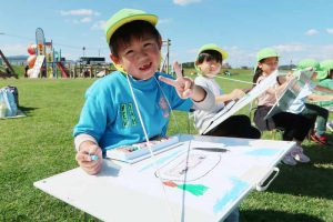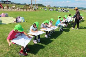 降車の堀内駅では、同じ列車に乗っていた旅行客の方々と「いってらっしゃい!」と手を振り合い、心温まる交流もできました。その後、のんちゃんパークへ移動。到着すると、さっそく画用紙に向かい、三鉄列車のイメージを膨らませながらお絵描きを始めました。レトロ列車を描く子もいれば、車窓から見た風景を思い出して表現する子もいて、子どもたちの豊かな発想と表現力が感じられました。