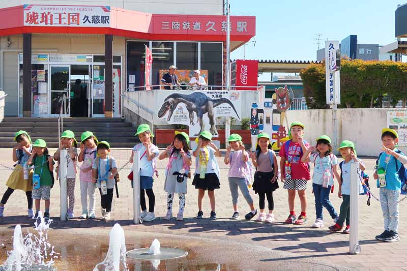 久慈駅では出発前から噴水や恐竜のパネルに興味津々の子どもたち。三鉄の車内では、窓の外に広がる景色に「おばあちゃんち見えるかな?」「海が見えたあ!」と声を弾ませながら、三鉄体験を楽しんでいました。安家川橋梁で列車が停車すると、感激した様子でマリンブルーの海を眺めていました。