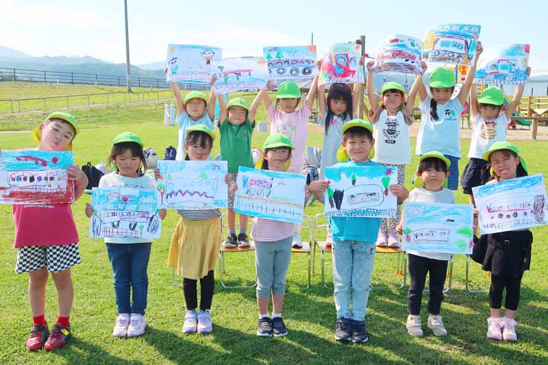 降車の堀内駅では、同じ列車に乗っていた旅行客の方々と「いってらっしゃい!」と手を振り合い、心温まる交流もできました。その後、のんちゃんパークへ移動。到着すると、さっそく画用紙に向かい、三鉄列車のイメージを膨らませながらお絵描きを始めました。レトロ列車を描く子もいれば、車窓から見た風景を思い出して表現する子もいて、子どもたちの豊かな発想と表現力が感じられました。