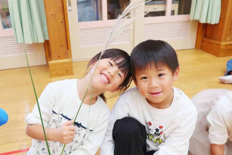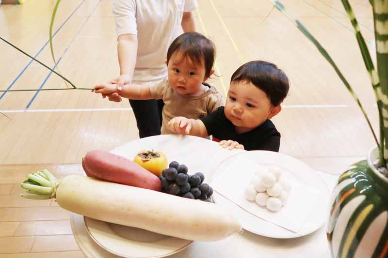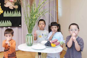 会場には、お団子やススキ、旬の野菜や果物をお供えしました。お団子は月に、ススキは稲穂に見立て、悪いものから守ってくれるという意味もあることを学びました。子どもたちは、自然の恵みに感謝し、翌年の豊作を願う行事であることを理解しながら参加していました。