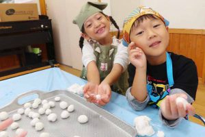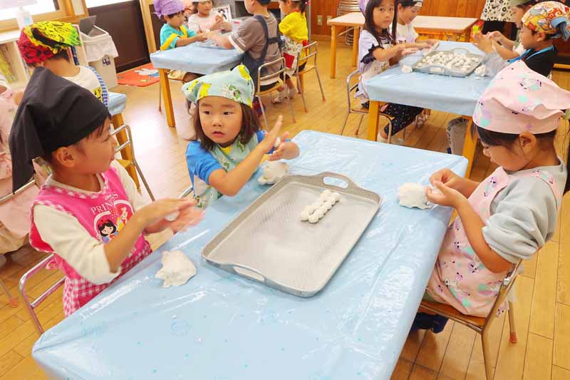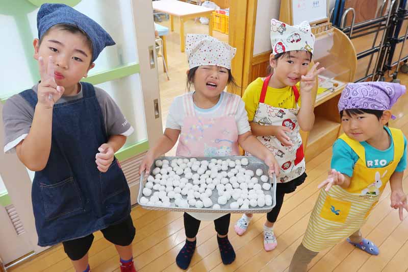 お月見団子は、たんぽぽさんが作ってくれました。米粉をこねながら「あったかいねえ!」と言いながら、一つひとつ丁寧に丸めていました。子どもたちはお団子のやわらかい感触を楽しみながら、作ることの喜びを感じてるようでした。
