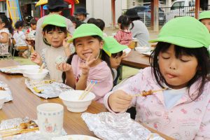 焼きたてのお芋と焼き鳥の試食では、「おいしい~!」と満足そうに頬張る子どもたち。