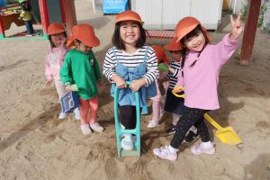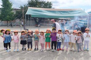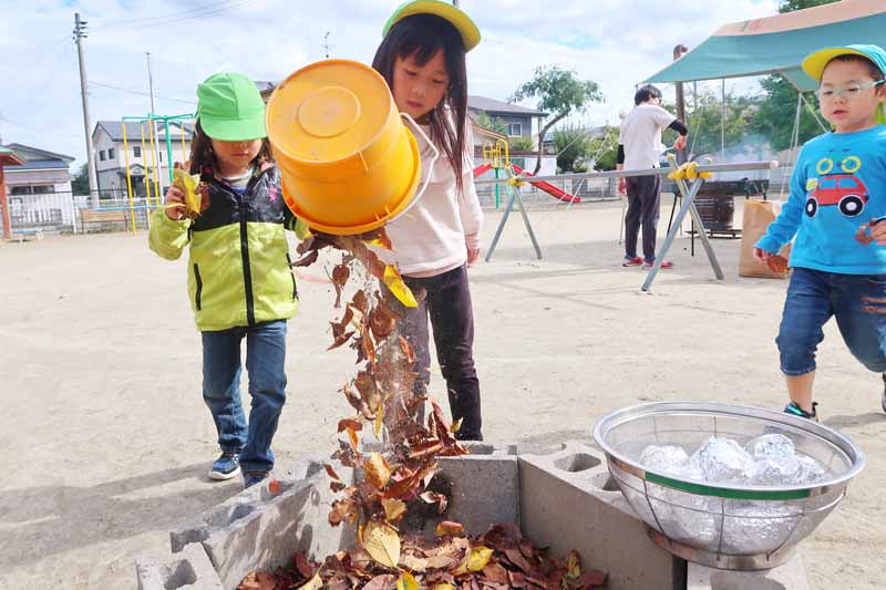 焼き芋や焼き鳥、いものこ汁の香ばしいにおいと煙が漂う園庭で、いつもとは違う野外での昼食準備の雰囲気を楽しみながら遊ぶ姿には、笑顔があふれていました。