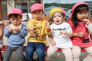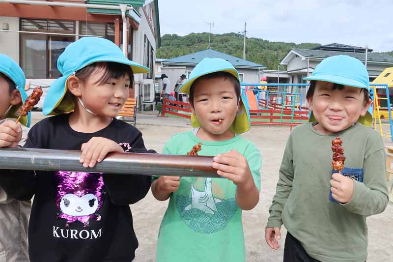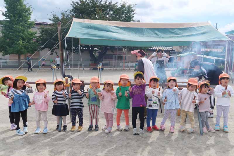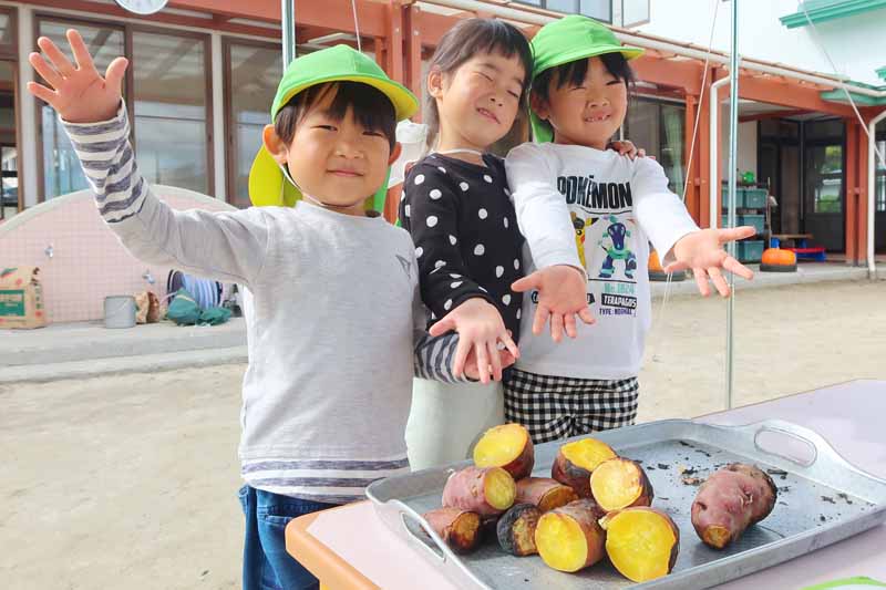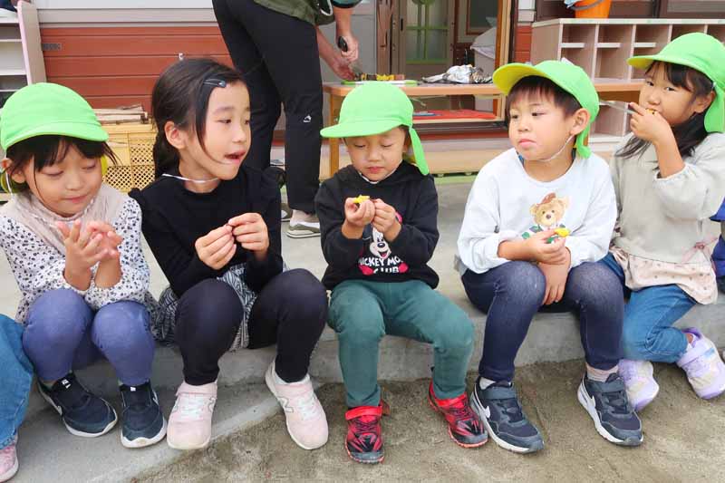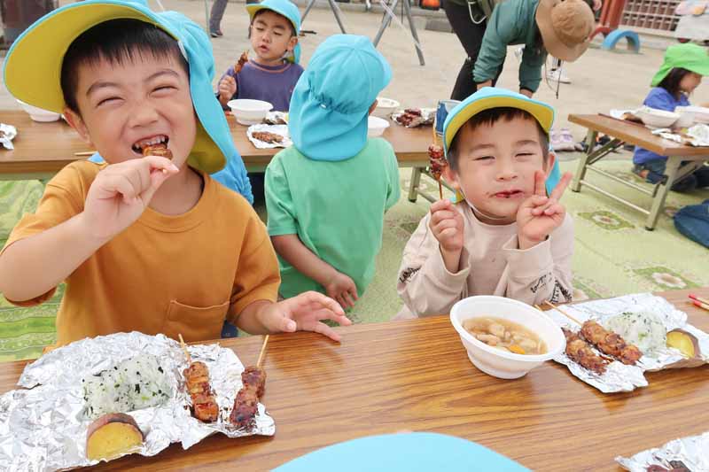 焼きたてのお芋と焼き鳥の試食では、「おいしい~!」と満足そうに頬張る子どもたち。
