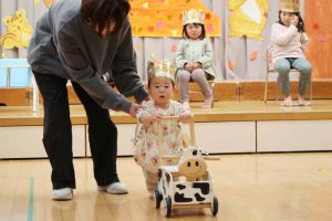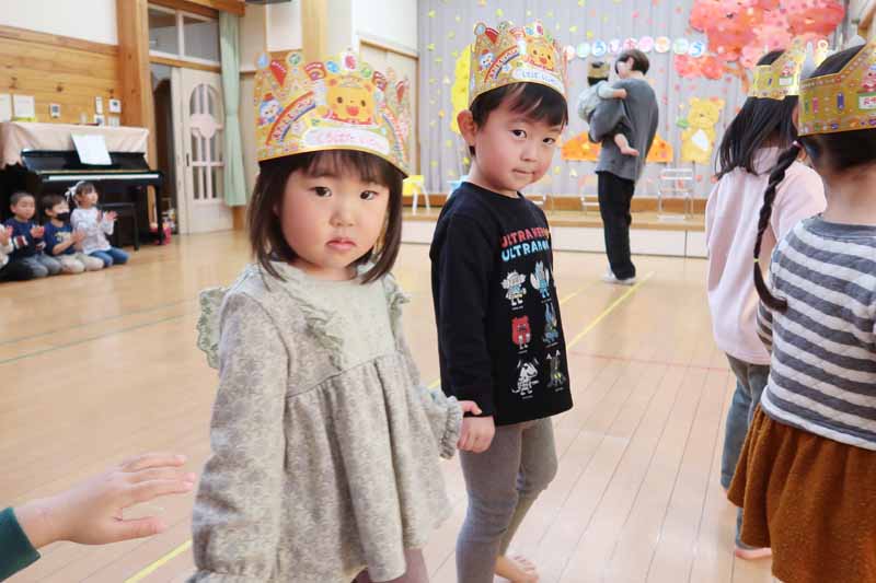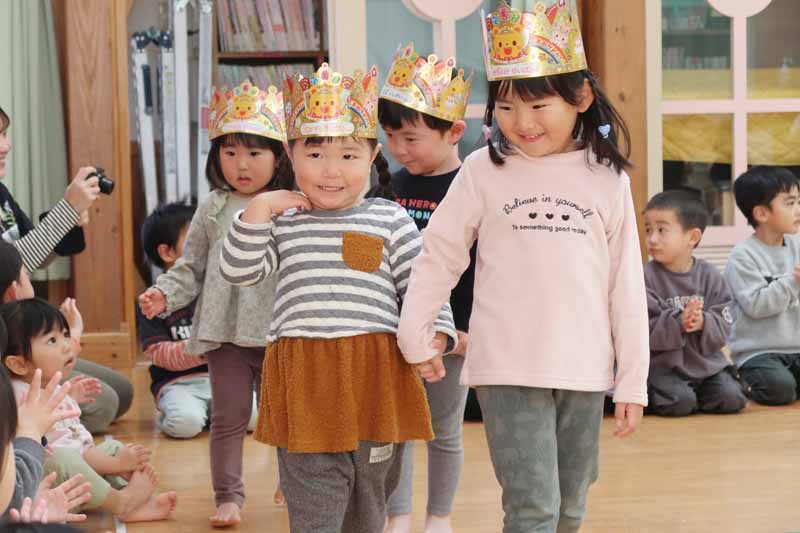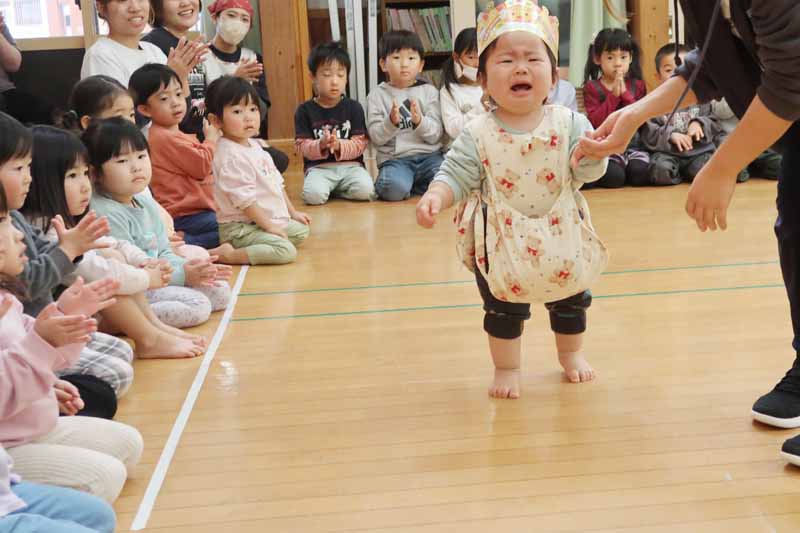 誕生会を楽しみにしていた誕生児さんたちは、みんなの拍手に迎えられ、笑顔で入場していました。ももさんの2人は、途中で先生に抱っこしてもらい、安心した表情で会場を回っていました。