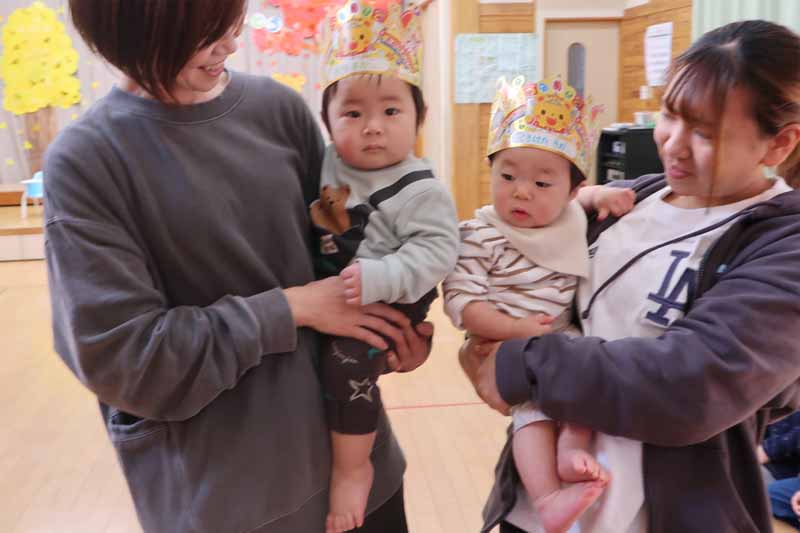 11月生まれのお友だちは6名。そのうち、ももさん2名が1歳を迎え、背負いもちでお祝いをしました。