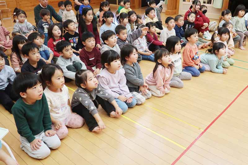 先生からの出し物は、『ドーナツくださいな!』のパネルシアターでした。ドーナツ屋さんに動物たちが買いに来ますが、2つのドーナツの裏側の色が同じになったら食べられるとあって、子どもたちは、めくられた色をよく覚えながら、「そこじゃない!」「もっと上!」「横!」と声を上げ、集中して楽しんでいました。キリンやうさぎがドーナツを浮き輪やマフラーにする場面では、笑い声があふれていました。