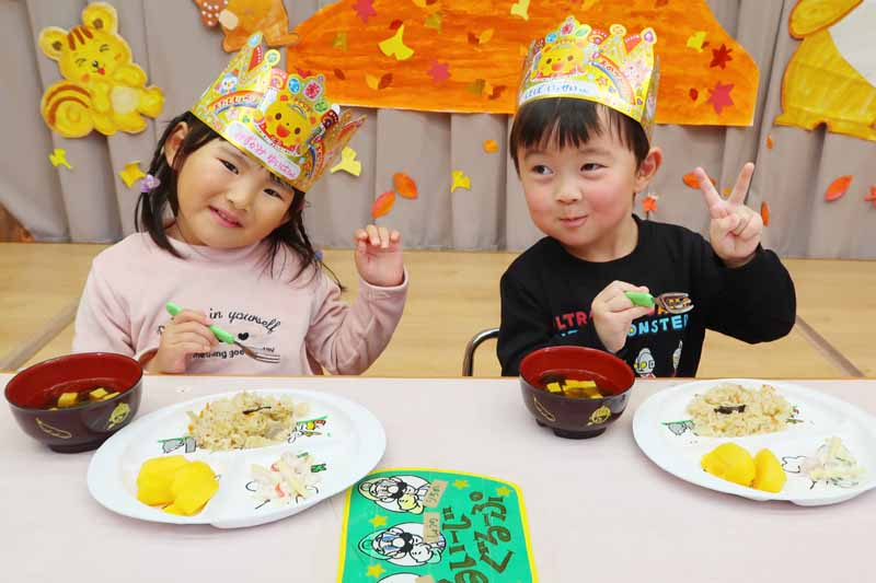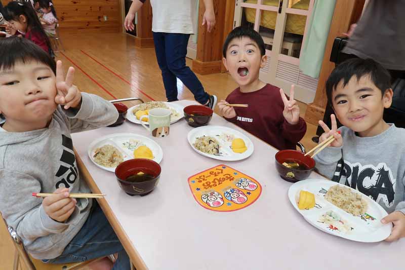 会食は、「炊き込みご飯、マカロニサラダ、すまし汁、フルーツ」でした。子どもたちはおかわりもしながら、おいしくいただくことができました。