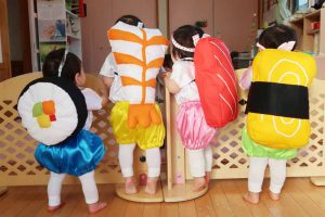 『おすしのピクニック』の発表に向けて、リュック型のお寿司のネタを背負ったり、ねじりはちまきを身につけたりしながら、早い段階から遊びの中で慣れていきました。