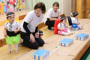 『おすしのピクニック』の発表に向けて、リュック型のお寿司のネタを背負ったり、ねじりはちまきを身につけたりしながら、早い段階から遊びの中で慣れていきました。