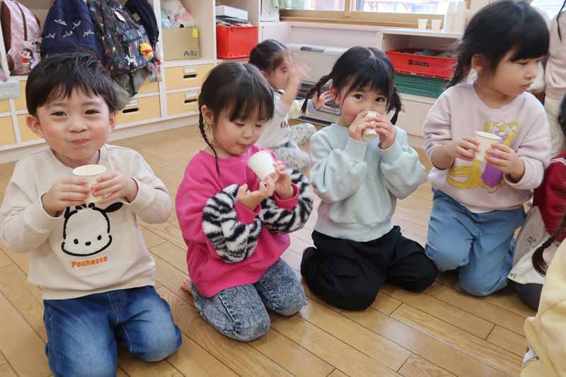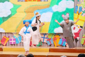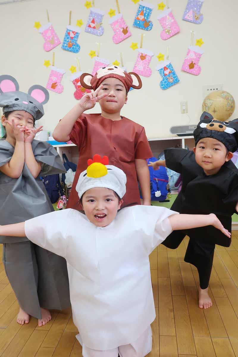 たんぽぽさんは、「十二支のはじまり」の劇を発表しました。一人ひとりが役を持ち、お互いの表現を認め合いながら練習に取り組んできました。セリフや動きなど、自分なりの表現に自信と喜びをもって、本番でも堂々と発表することができました。劇を通して、干支への関心もさらに深まっている様子が見られました。