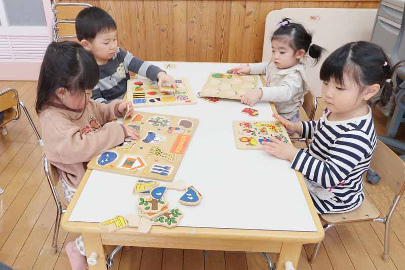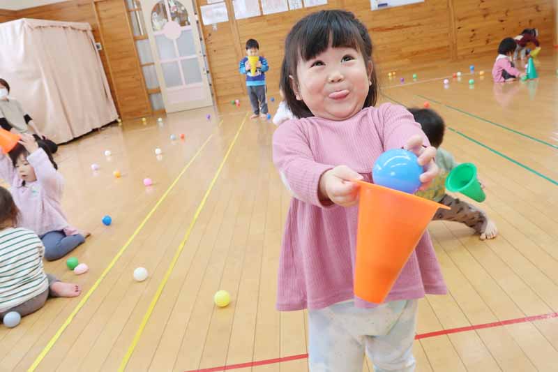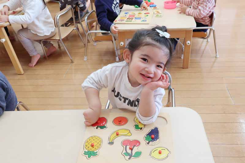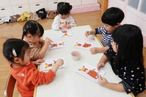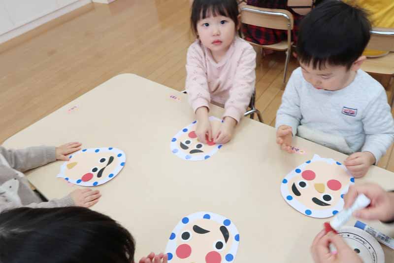 顔のパーツを貼っていく過程は、お正月遊びの福笑いのようで、楽しそうでした。眉毛、目、鼻、ほっぺ、口などの位置やバランスを考えながら貼る真剣な表情から、大きな成長を感じることができました。