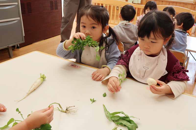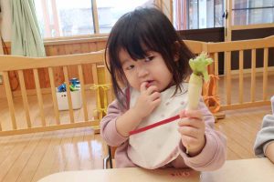 7日(水)の七草の日には、もみじさんも春の七草に触れてみました。匂いに少し戸惑う様子も見られましたが、興味をもって手に取る姿が見られました。