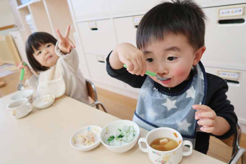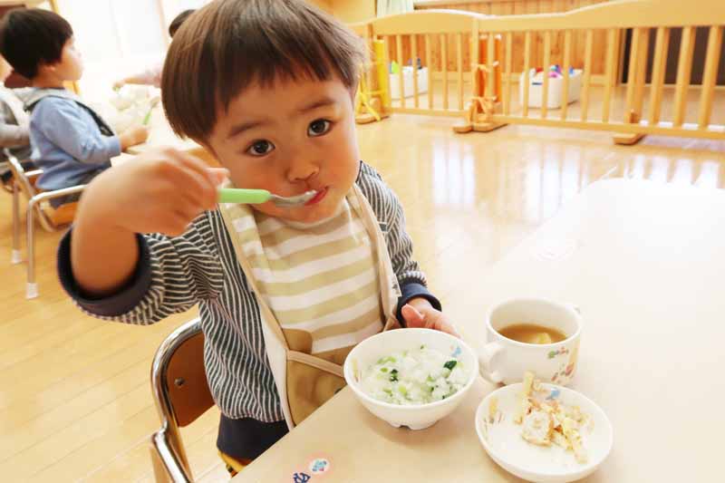 給食の七草がゆは、スズナやスズシロもおかゆと一緒にやわらかく炊いてもらい、おいしく味わいながら食べることができました。