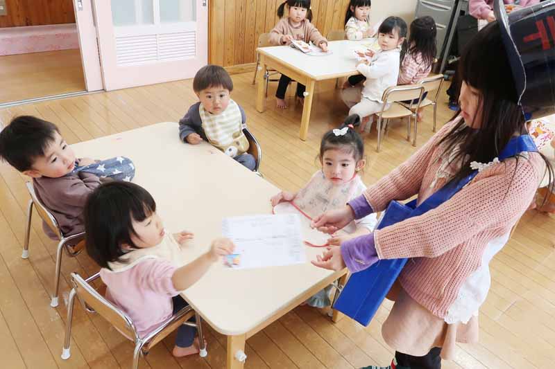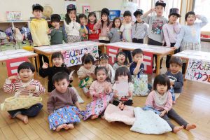 完成した作品を展示すると、「見て、おかめさんだよ!」「○○のひょっとこさんだよ!」と、先生や友だち同士で教え合って紹介する姿が見られ、満足する活動になったことが感じられました。