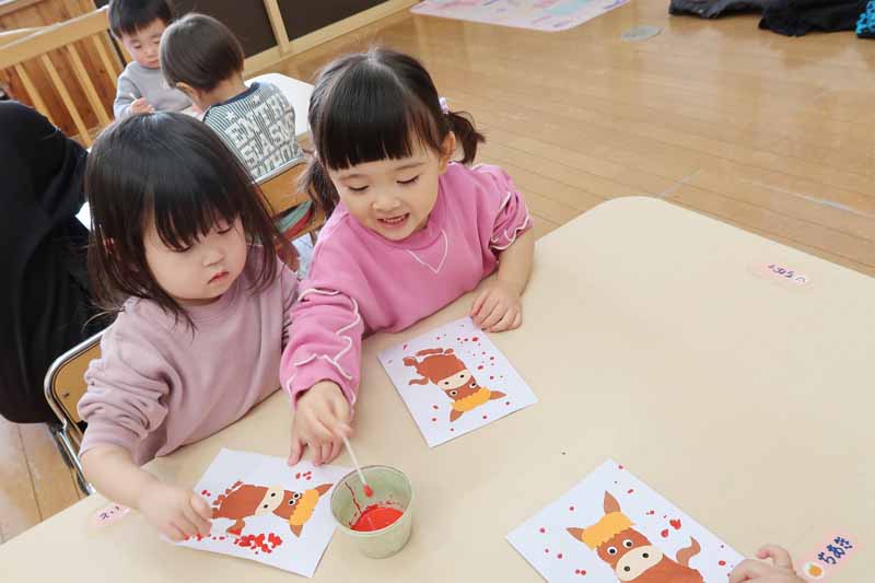 はがき作りでは、足形スタンプをベースにして、かわいらしい馬の絵を描きました。じっくりと丁寧に取り組む子どもたちの姿に、感心しました。