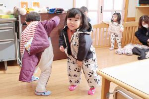 防寒具のジャンプスーツをテキパキと着こなす様子は、「早く!外で!雪遊びがしたい!」という気持ちが伝わってくるようでした。