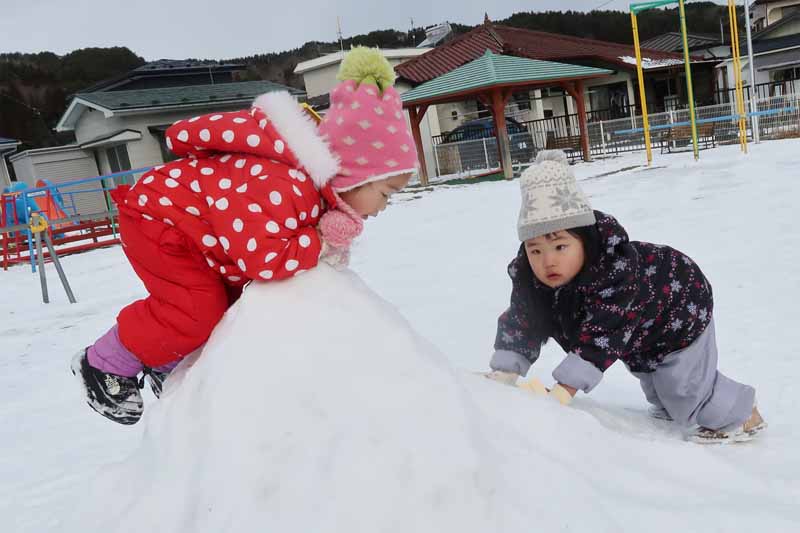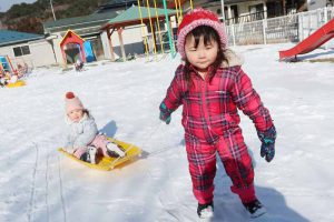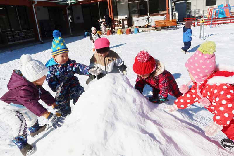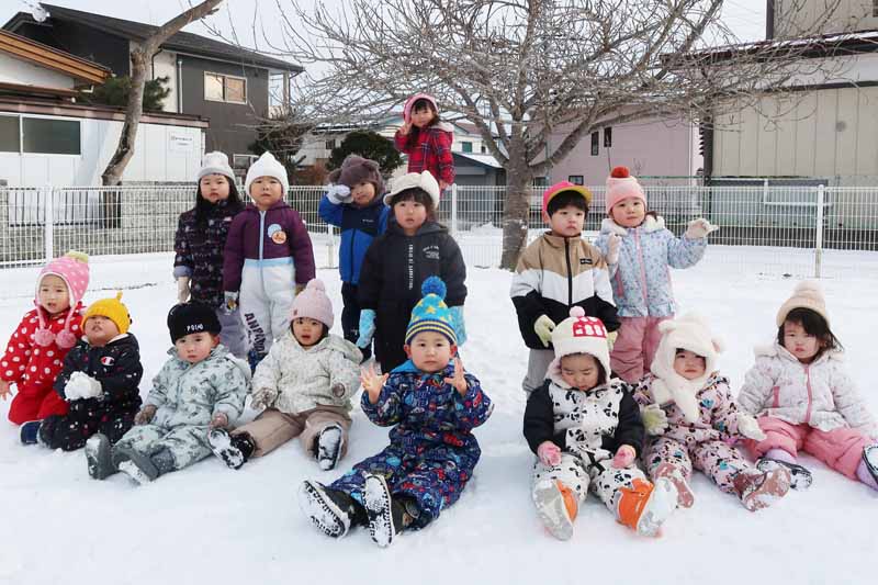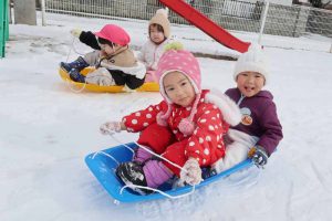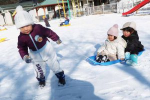 雪山によじ登ろうと何度も挑戦したり、友だち同士でそりを引っ張ってあげたり、お兄さん・お姉さんらしい思いやりの気持ちが育っていて、冬ならではの雪遊びを通して、子どもたちの成長を感じる、うれしい体験となりました。
