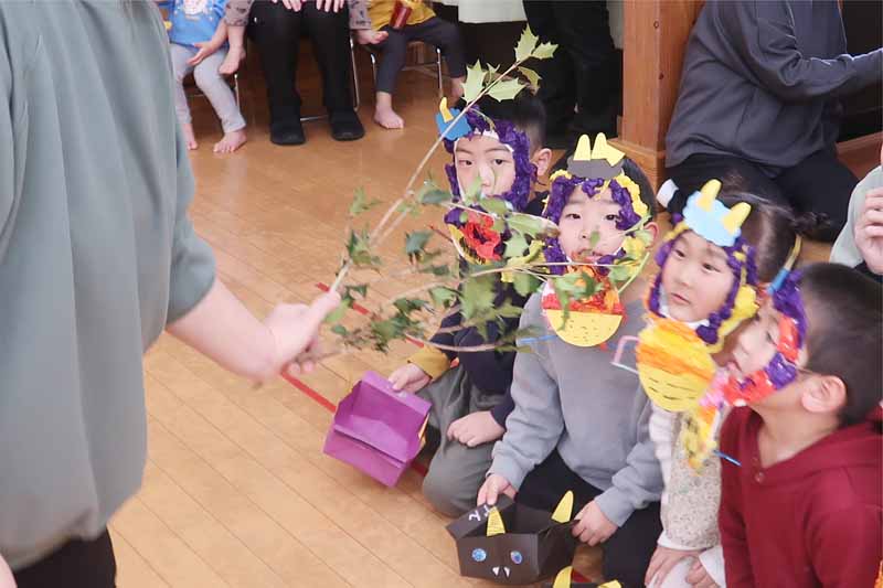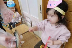 先生から節分や豆まき、立春についてのお話があり、鬼が苦手とされる「ひいらぎ」と「いわし」も見せてもらいました。子どもたちは「鬼はきらいなんだね!」と興味をもちながら、葉のとげとげやいわしの匂いに触れていました。