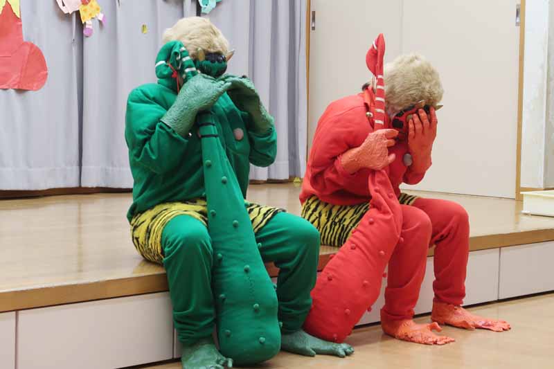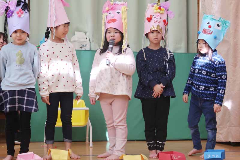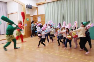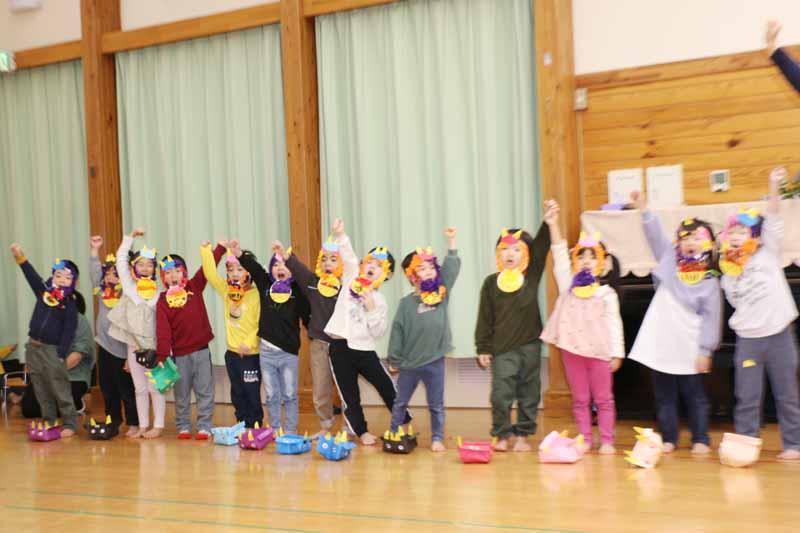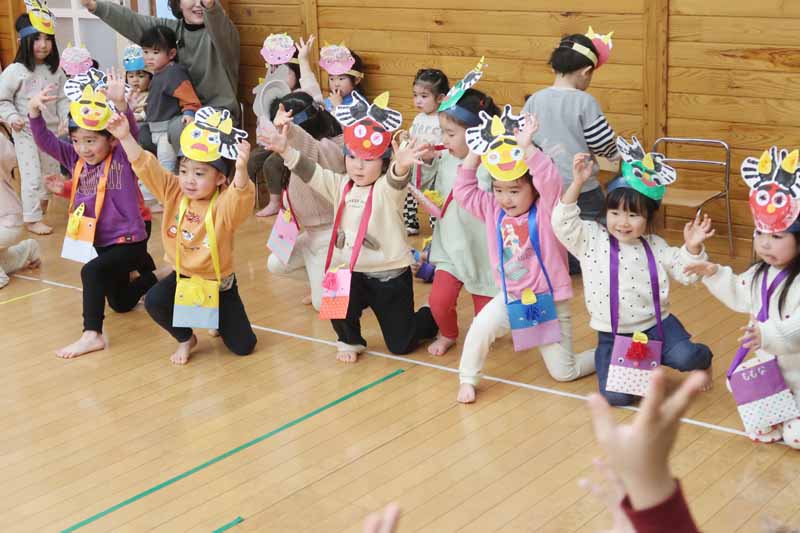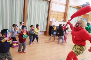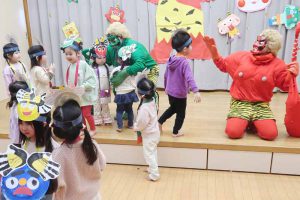 すみれさんは、「遊んでいて楽しくなりすぎてしまう『おふざけ鬼』を追い出します!」と発表し、「みんなでやっつけるぞ~!」のかけ声に「おお~!!」と元気な声が響いていました。