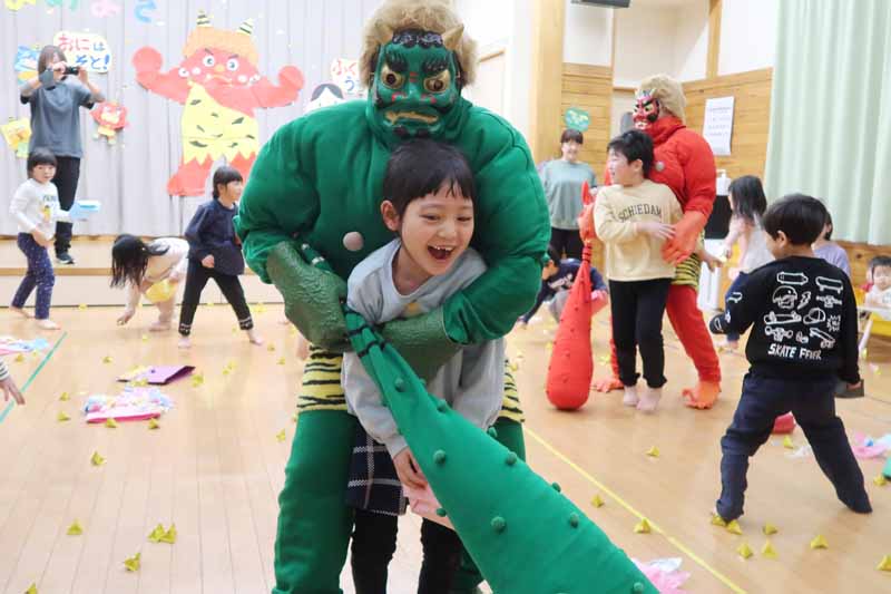 大きいクラスの子どもたちの豆まきは迫力があり、ホールいっぱいに鬼を追いかけて立ち向かう姿が見られ、鬼たちも必死に逃げ回っていました。鬼に捕まってハグされると、思わずうれしそうな笑顔を見せる場面もありました。