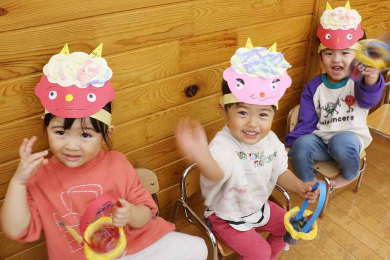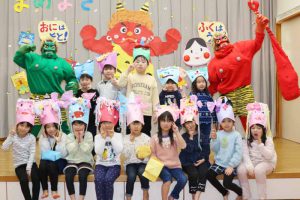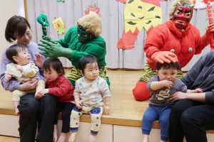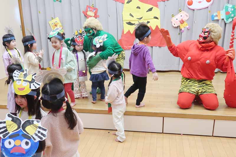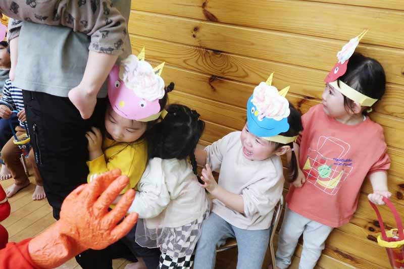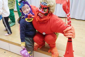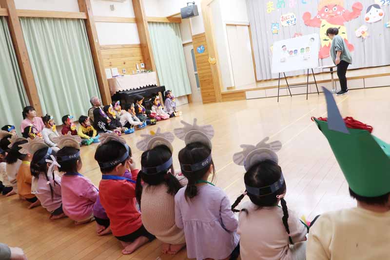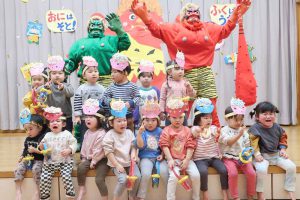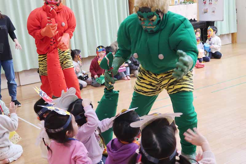 先生からは『豆まきってなあに?』のパネルシアターを見せてもらい、子どもたちは鬼の登場を楽しみに待っていました。