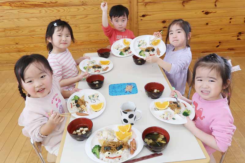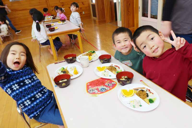 子どもたちは、ケチャップで描かれた鬼の口元を見て「あっ!笑ってる~!」「怒ってる~!」と喜んだり、海苔でできた眉毛を動かしていろいろな表情に変えてみたりと、楽しみながら食事をしていました。