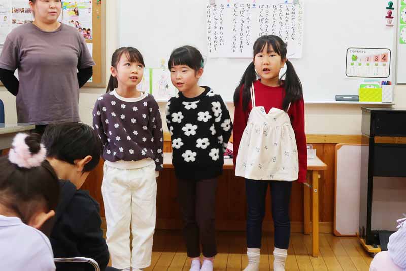すみれ組は、朝の会の質問タイムでは「大きくなったら何になりたいかな?」という質問に、「パトカーに乗ってみたいです!」「消防士になりたいです!」など、一人ひとりが自分の思いをしっかりと答えていました。