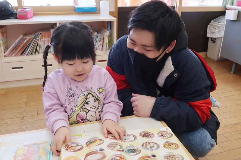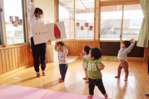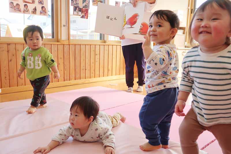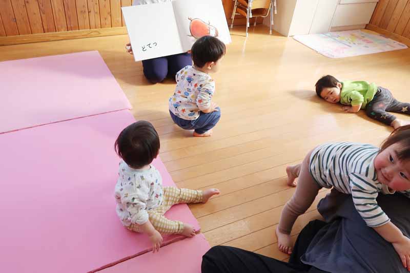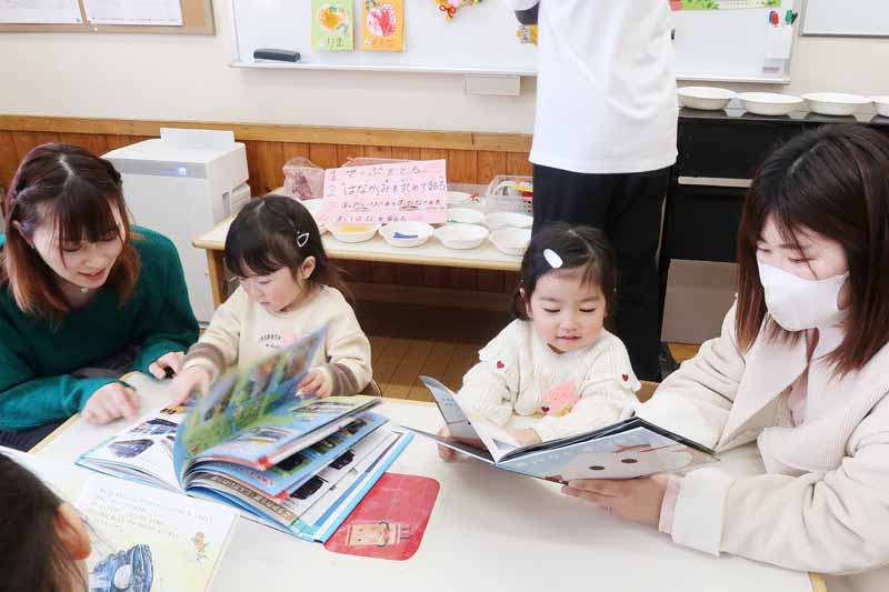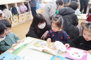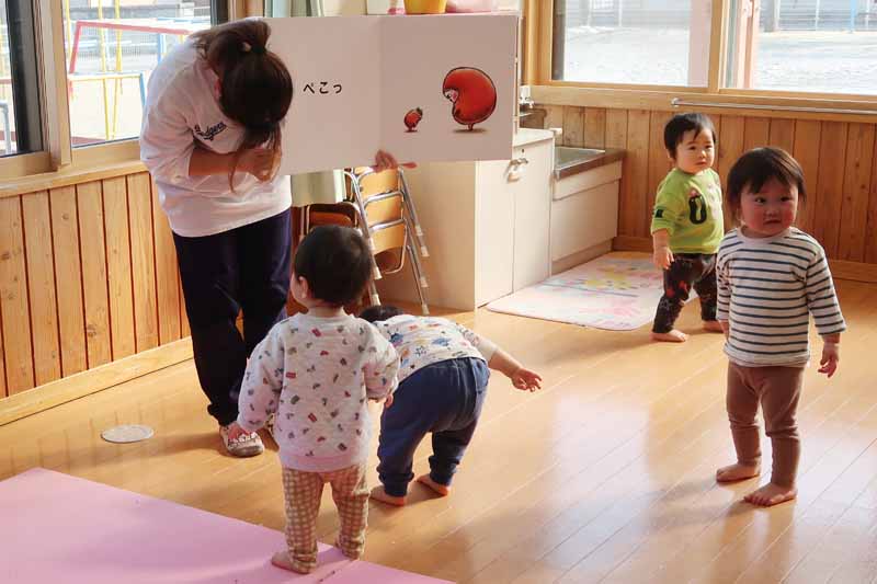 また、『だるまさんが』の絵本に触れながら、「どてっ!」「びろーん!」「ぺこっ!」といった場面に合わせて、かわいらしいしぐさで表現する姿も見られ、もも組さんなりに絵本の世界を楽しんでいる姿をみせていました。