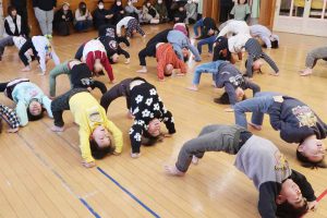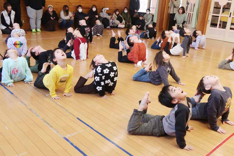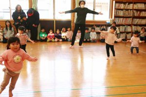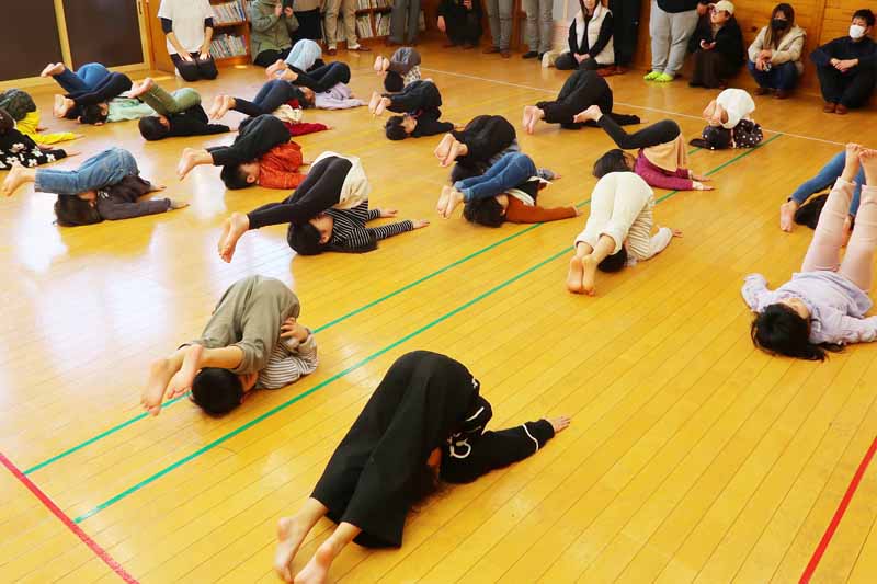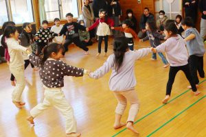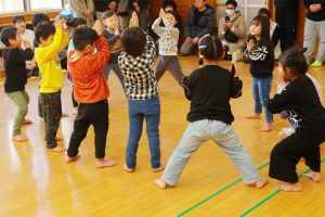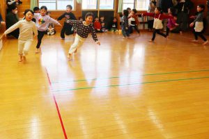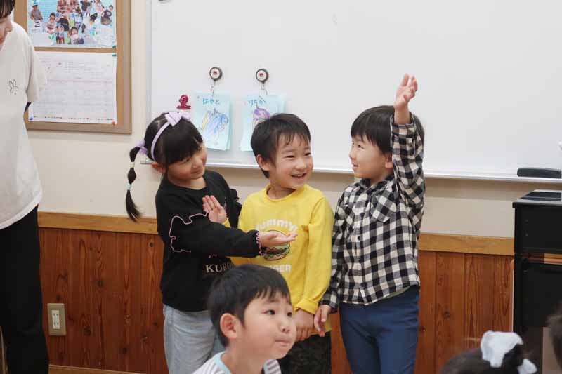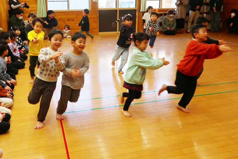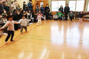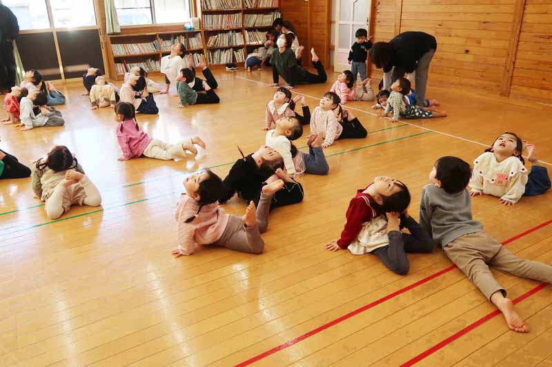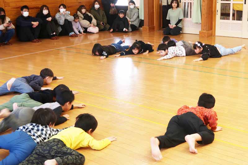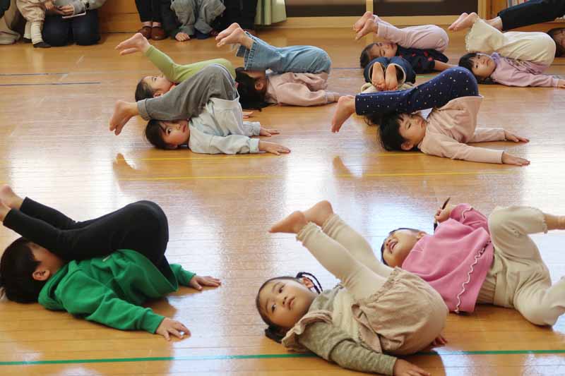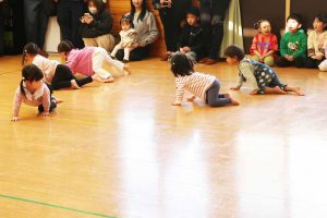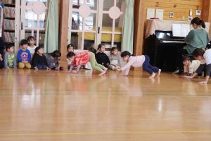 4・5歳児らしく、スピード感やしなやかな動きに加え、周りの友だちとの距離感も意識しながら、トンビやカタツムリの動きを表現する姿に感心しました。