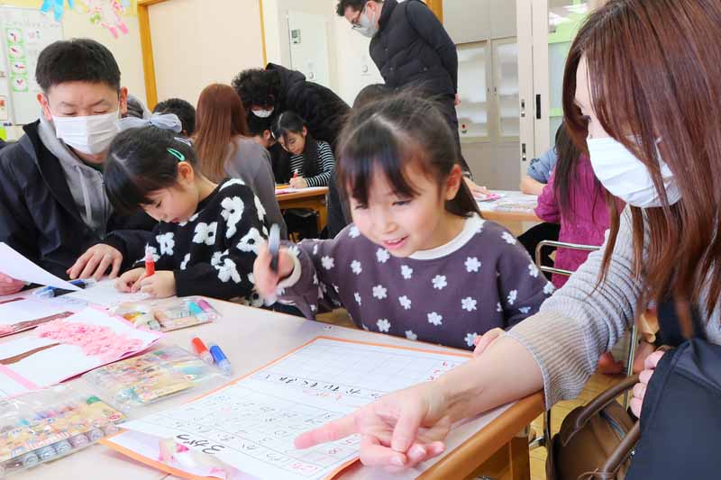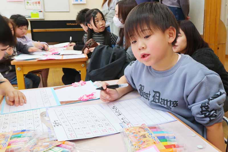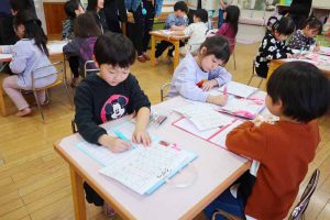 参観日の活動は、『3月のカレンダー作り』でした。たんぽぽさんたちは、小学校入学への楽しみとともに、多少の不安も感じているようです。そこで、園生活最後となる3月のカレンダーを作り、楽しみにしている行事を書き込むことで、入学までの一日一日を数えながら期待感へとつなげていけるよう、お家の人と一緒に完成させることができました。