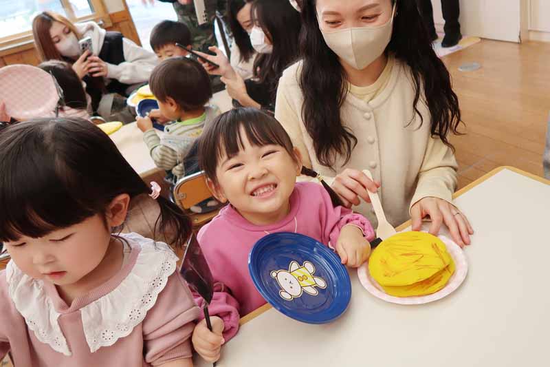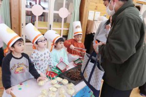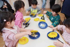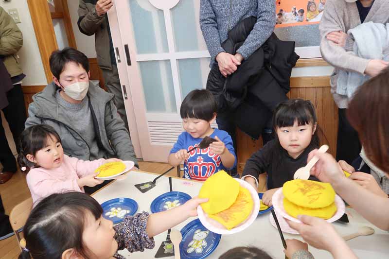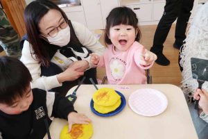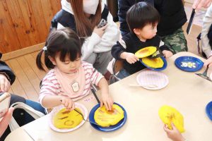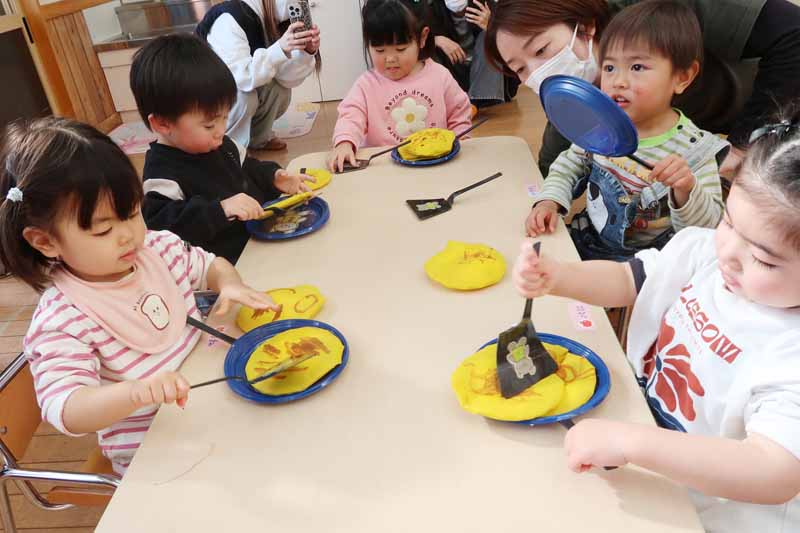 『しろくまちゃんのホットケーキ』の絵本が大好きなもみじ組さんは、参観日前に、小麦粉と卵を混ぜて焼き、はちみつをたっぷり塗ってみんなで食べるという食育活動を行っていました。