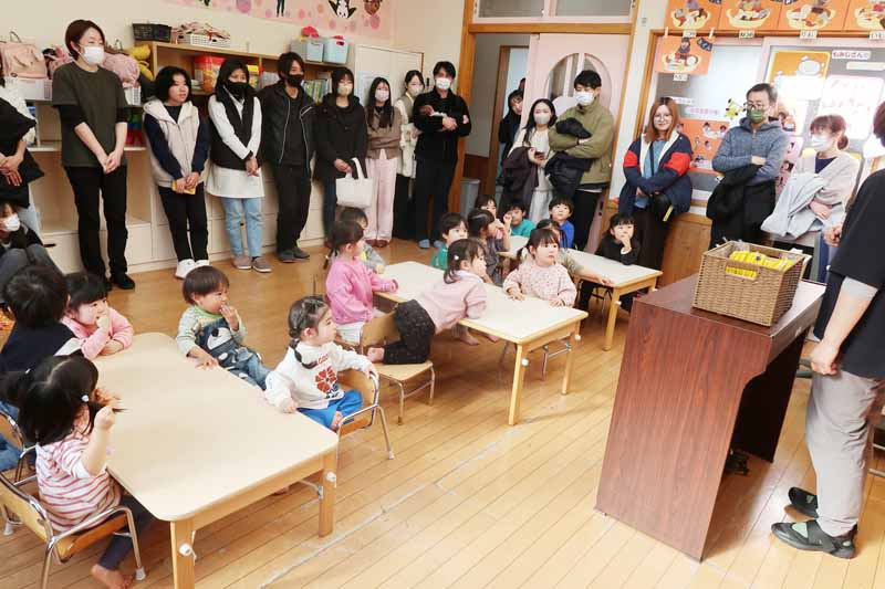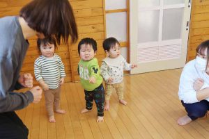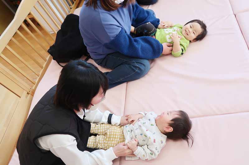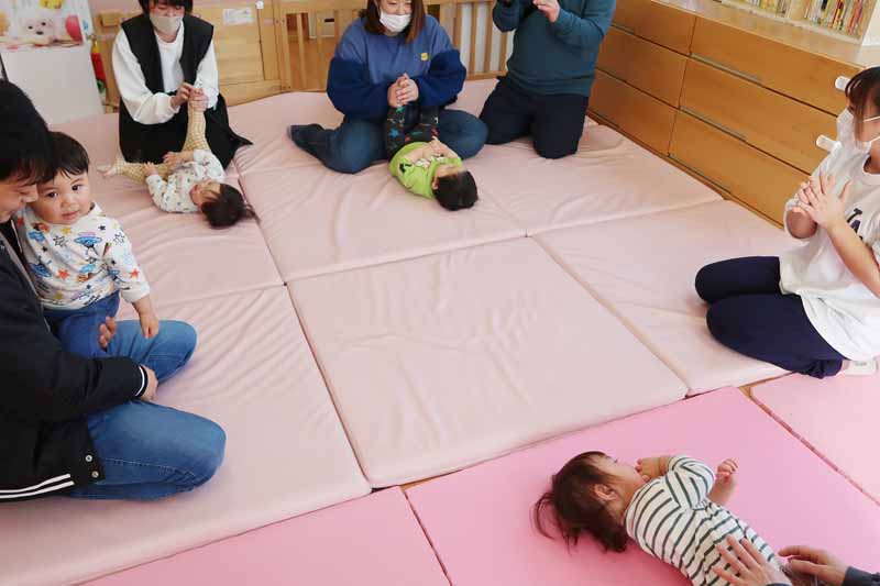 遊びを通して、「幸福感やさまざまな感覚刺激が脳の発達につながること、また乳幼児期の愛着形成にとって大切な時間であること」などもお伝えしました。保護者の方からも「楽しそうだねえ~!」と、子どもたちに声をかけていました。