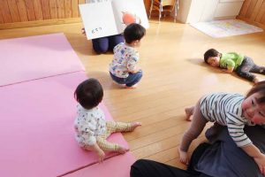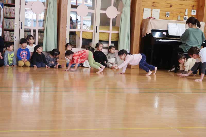 ワニの動きでは、足の指先でしっかりと床を蹴って進み、手足の協応動作の発達も感じられました。