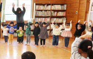 最初に、ちゅうりっぷ組・もみじ組・もも組の3クラス合同でリズム運動を行いました。