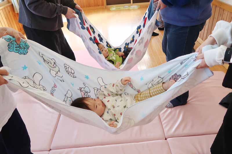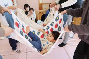 感覚遊び(バスタオルブランコ・いっぽんばしこちょこちょ・ボールプール)を、大好きなお父さんやお母さんと一緒に楽しむことで、子どもたちは安心した表情でのびのびと遊ぶ姿が見られました。