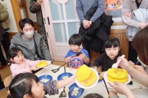 できあがったホットケーキを手に、「はい、どうぞ~!」と周りのおかあさんたちに声をかけると、「おいしいね~!」と応えてくれて、子どもたちはとてもうれしそうな表情を見せていました。