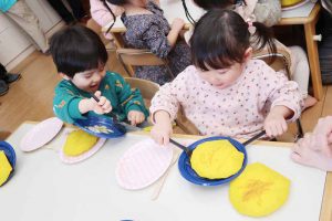 もみじ組は、不織布を使ったホットケーキ作りの製作遊びを行いました。